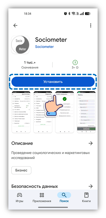 Чтобы установить программу через "Google Play", введите в поисковой строке "Sociometer" и выберите