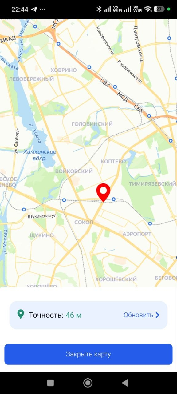 После нажатия «Начать» на экране появится карта с вашей текущей геопозицией.